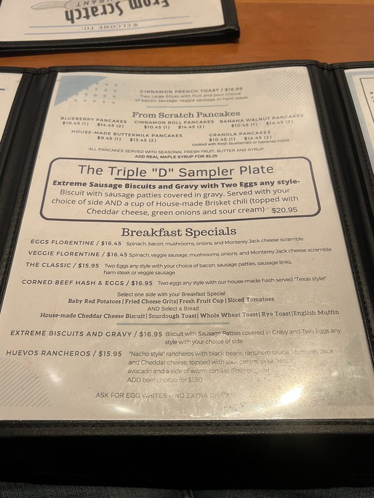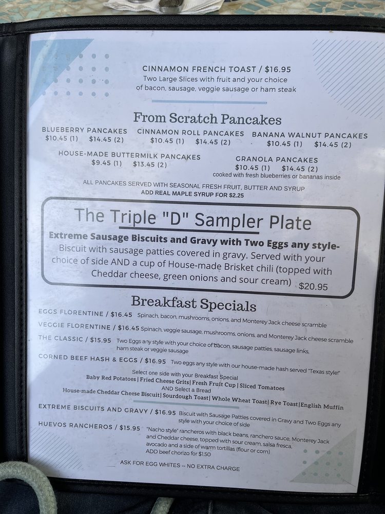 Extreme Sausage Biscuits and Gravy with Two Eggs any style Biscuit with sausage patties covered in gravy. Served with your choice of From Scratch baby red potatoes, fried cheese grits, fruit cup OR sliced tomatoes and a cup of our Homemade Brisket Chili -topped with Cheddar cheese, green onions and sour cream.